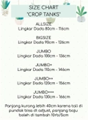 CROP TANKS Bahan : Rayon Super Adem Belakang full karet, super nyaman, tali bisa di atur, panjang boleh custom bagi yang gak suka crop ^^ Panjang baju kurang lebih 40cm masih bisa diatur karena tali di pundak bisa di adjust ya..