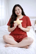 Dengan atasan kaos & celana pendek super cute nyaman banget huat tidur